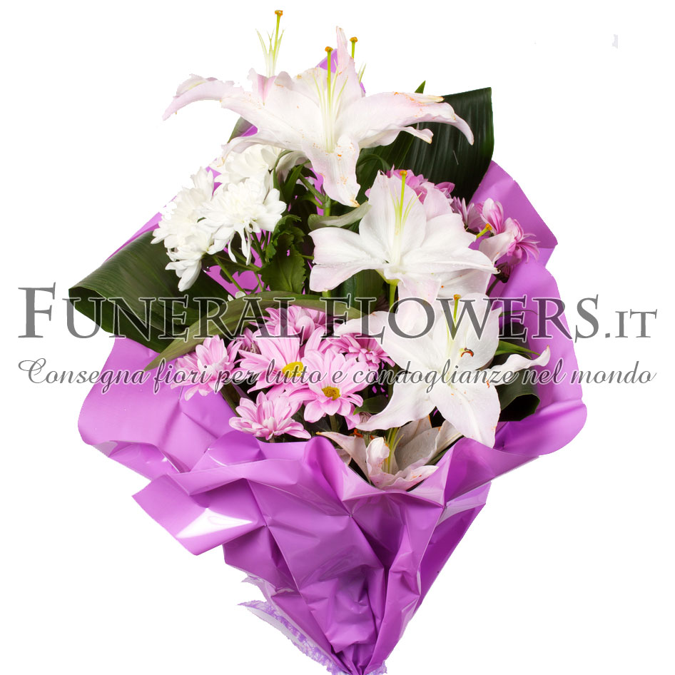 Bouquet funebre con rose bianche e asltroemeria rosa